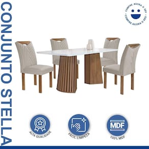 Renove sua sala de jantar com o conjunto Mesa Stella, acompanhado por quatro cadeiras. A mesa tem um visual moderno, com linhas suaves e elegantes. As cadeiras são confortáveis e têm um estilo sofisticado. Juntos, eles fazem da sua sala de jantar um lugar especial para reunir a família e os amigos. Medida da Mesa (A x L x P): 79cmx120cmx90cm Peso da Mesa: 56,4 kg Mesa suporta até: 40.0000 Acabamento da Cadeira/Banco: Pintura Acabamento da Mesa: Pintura UV Acompanha Manual de Instalação: Sim Almofada do assento: Fixa Ambiente Principal: Sala de Jantar Cadeira/Banco estofada: Encosto e Assento Estofados Cadeira/Banco Estofada: Encosto e Assento Estofados Cadeira/Banco suporta até: 120.0000 codigo_ean: 7909903599235 Complexidade da Montagem: Alta: deve ser montado por um montador especializado Cor: Chocolate/Off White/Veludo Bege Claro Cor do Produto: Chocolate/Off White/Veludo Bege Claro De Canto (Canto Alemão): Não Design da Base: Cilindro Enchimento do Assento: Espuma D-23 Enchimento do Encosto: Espuma D-20 Escala de Brilho: Fosco Espessura do Tampo: 29 mm Estrutura do Assento: MDF Estrutura do Encosto: MDF Formato do Tampo: Retangular Itens Inclusos: 1 Mesa Stella com 4 cadeiras e manual de montagem Linha ou Coleção: Stella Manual de Montagem e Instalação: https://product-hub-prd.madeiramadeira.com.br/895907/documents/6dea87e3-eeab-4983-822b-143dac67f1bbA20NEVADA20CADEIRA20NEVADA.pdf Material da Base da Mesa: MDF Material da Estrutura da Cadeira: MDF Material do Tampo: Vidro/MDF Material Principal: MDF Material Principal das Cadeiras/Bancos: MDF Medida da Cadeira/Banco (A x L x P): 96,5cmx56cmx44cm Medida do Tampo (L x C x E): 120cmx90cmx2,9cm Mesa Dobrável: Não Mesa Extensível: Não Necessita Montagem: Sim Origem do Produto: Nacional Peso da Cadeira/Banco: 9,1 kg Possui Apoio para Braços: Não Possui Apoio Para os Pés: Não Possui Prateleiras: Não Possui Suporte Giratório: Não Possui Vidro: Sim Quantidade de Cadeiras: 4 Quantidade de Lugares: 04 Recomendações de Uso, Manutenção e Limpeza: Limpar apenas com pano úmido. Revestimento da Cadeira/Banco: Veludo Sistema de Montagem: Parafusos Tipo de Assento: Fixo Tipo de Encosto: Fixo