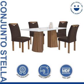 Renove sua sala de jantar com o conjunto Mesa Stella, acompanhado por quatro cadeiras. A mesa tem um visual moderno, com linhas suaves e elegantes. As cadeiras são confortáveis e têm um estilo sofisticado. Juntos, eles fazem da sua sala de jantar um lugar especial para reunir a família e os amigos. Medida da Mesa (A x L x P): 79cmx120cmx90cm Peso da Mesa: 56,4 kg Mesa suporta até: 40.0000 Acabamento da Cadeira/Banco: Pintura Acabamento da Mesa: Pintura UV Acompanha Manual de Instalação: Sim Almofada do assento: Fixa Ambiente Principal: Sala de Jantar Cadeira/Banco estofada: Encosto e Assento Estofados Cadeira/Banco Estofada: Encosto e Assento Estofados Cadeira/Banco suporta até: 120.0000 codigo_ean: 7909903599211 Complexidade da Montagem: Alta: deve ser montado por um montador especializado Cor: Chocolate/Off White/Veludo Marrom Cor do Produto: Chocolate/Off White/Veludo Marrom De Canto (Canto Alemão): Não Design da Base: Cilindro Enchimento do Assento: Espuma D-23 Enchimento do Encosto: Espuma D-20 Escala de Brilho: Fosco Espessura do Tampo: 29 mm Estrutura do Assento: MDF Estrutura do Encosto: MDF Formato do Tampo: Retangular Itens Inclusos: 1 Mesa Stella com 4 cadeiras e manual de montagem Linha ou Coleção: Stella Manual de Montagem e Instalação: https://product-hub-prd.madeiramadeira.com.br/895905/documents/7a7707c8-b032-4bcc-8a2a-cd2b4bca0187A20NEVADA20CADEIRA20NEVADA.pdf Material da Base da Mesa: MDF Material da Estrutura da Cadeira: MDF Material do Tampo: Vidro/MDF Material Principal: MDF Material Principal das Cadeiras/Bancos: MDF Medida da Cadeira/Banco (A x L x P): 96,5cmx56cmx44cm Medida do Tampo (L x C x E): 120cmx90cmx2,9cm Mesa Dobrável: Não Mesa Extensível: Não Necessita Montagem: Sim Origem do Produto: Nacional Peso da Cadeira/Banco: 9,1 kg Possui Apoio para Braços: Não Possui Apoio Para os Pés: Não Possui Prateleiras: Não Possui Suporte Giratório: Não Possui Vidro: Sim Quantidade de Cadeiras: 4 Quantidade de Lugares: 04 Recomendações de Uso, Manutenção e Limpeza: Limpar apenas com pano úmido. Revestimento da Cadeira/Banco: Veludo Sistema de Montagem: Parafusos Tipo de Assento: Fixo Tipo de Encosto: Fixo