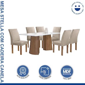 Renove sua sala de jantar com o conjunto Mesa Stella, acompanhado por seis cadeiras. A mesa tem um visual moderno, com linhas suaves e elegantes. As cadeiras são confortáveis e têm um estilo sofisticado. Juntos, eles fazem da sua sala de jantar um lugar especial para reunir a família e os amigos. Medida da Mesa (A x L x P): 79cmx170cmx90cm Peso da Mesa: 69,5 kg Mesa suporta até: 40.0000 Acabamento da Cadeira/Banco: Pintura Acabamento da Mesa: Pintura UV Acompanha Manual de Instalação: Sim Almofada do assento: Fixa Ambiente Principal: Sala de Jantar Cadeira/Banco estofada: Encosto e Assento Estofados Cadeira/Banco Estofada: Encosto e Assento Estofados Cadeira/Banco suporta até: 120.0000 codigo_ean: 7909903599129 Complexidade da Montagem: Alta: deve ser montado por um montador especializado Cor: Chocolate/Off White/Boucle Bege Cor do Produto: Chocolate/Off White/Boucle Bege De Canto (Canto Alemão): Não Design da Base: Pedestal Enchimento do Assento: Espuma D-23 Enchimento do Encosto: Espuma D-20 Escala de Brilho: Fosco Espessura do Tampo: 29 mm Estrutura do Assento: MDF Estrutura do Encosto: MDF Formato do Tampo: Retangular Itens Inclusos: 1 Mesa Stella com 6 cadeiras e manual de montagem Linha ou Coleção: Stella Manual de Montagem e Instalação: https://product-hub-prd.madeiramadeira.com.br/895895/documents/7384ba8e-5b37-4e2a-b53b-e5697ae6a6f3A20NEVADA20CADEIRA20NAPOLE.pdf Material da Base da Mesa: MDF Material da Estrutura da Cadeira: MDF Material do Tampo: Vidro/MDF Material Principal: MDF Material Principal das Cadeiras/Bancos: MDF Medida da Cadeira/Banco (A x L x P): 96,5cmx56cmx44cm Medida do Tampo (L x C x E): 170cmx90cmx2,9cm Mesa Dobrável: Não Mesa Extensível: Não Necessita Montagem: Sim Origem do Produto: Nacional Peso da Cadeira/Banco: 9,1 kg Possui Apoio para Braços: Não Possui Apoio Para os Pés: Não Possui Prateleiras: Não Possui Suporte Giratório: Não Possui Vidro: Sim Quantidade de Cadeiras: 6 Quantidade de Lugares: 06 Recomendações de Uso, Manutenção e Limpeza: Limpar apenas com pano úmido. Revestimento da Cadeira/Banco: Veludo Sistema de Montagem: Parafusos Tipo de Assento: Fixo Tipo de Encosto: Fixo
