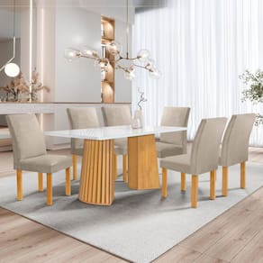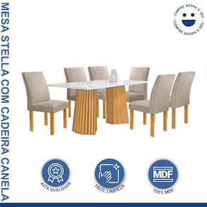 Renove sua sala de jantar com o conjunto Mesa Stella, acompanhado por seis cadeiras. A mesa tem um visual moderno, com linhas suaves e elegantes. As cadeiras são confortáveis e têm um estilo sofisticado. Juntos, eles fazem da sua sala de jantar um lugar especial para reunir a família e os amigos. Medida da Mesa (A x L x P): 79cmx170cmx90cm Peso da Mesa: 69,5 kg Mesa suporta até: 40.0000 Acabamento da Cadeira/Banco: Pintura Acabamento da Mesa: Pintura UV Acompanha Manual de Instalação: Sim Almofada do assento: Fixa Ambiente Principal: Sala de Jantar Cadeira/Banco estofada: Encosto e Assento Estofados Cadeira/Banco Estofada: Encosto e Assento Estofados Cadeira/Banco suporta até: 120.0000 codigo_ean: 7909903599198 Complexidade da Montagem: Alta: deve ser montado por um montador especializado Cor: Cinamomo/Off White/Boucle Bege Cor do Produto: Cinamomo/Off White/Boucle Bege De Canto (Canto Alemão): Não Design da Base: Pedestal Enchimento do Assento: Espuma D-23 Enchimento do Encosto: Espuma D-20 Escala de Brilho: Fosco Espessura do Tampo: 29 mm Estrutura do Assento: MDF Estrutura do Encosto: MDF Formato do Tampo: Retangular Itens Inclusos: 1 Mesa Stella com 6 cadeiras e manual de montagem Linha ou Coleção: Stella Manual de Montagem e Instalação: https://product-hub-prd.madeiramadeira.com.br/895903/documents/06d561bc-42a1-44f0-b061-db929448a3c7A20NEVADA20CADEIRA20NAPOLE.pdf Material da Base da Mesa: MDF Material da Estrutura da Cadeira: MDF Material do Tampo: Vidro/MDF Material Principal: MDF Material Principal das Cadeiras/Bancos: MDF Medida da Cadeira/Banco (A x L x P): 96,5cmx56cmx44cm Medida do Tampo (L x C x E): 170cmx90cmx2,9cm Mesa Dobrável: Não Mesa Extensível: Não Necessita Montagem: Sim Origem do Produto: Nacional Peso da Cadeira/Banco: 9,1 kg Possui Apoio para Braços: Não Possui Apoio Para os Pés: Não Possui Prateleiras: Não Possui Suporte Giratório: Não Possui Vidro: Sim Quantidade de Cadeiras: 6 Quantidade de Lugares: 06 Recomendações de Uso, Manutenção e Limpeza: Limpar apenas com pano úmido. Revestimento da Cadeira/Banco: Veludo Sistema de Montagem: Parafusos Tipo de Assento: Fixo Tipo de Encosto: Fixo