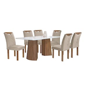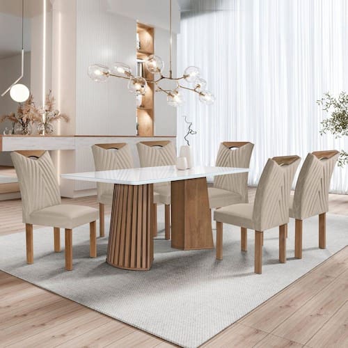 Renove sua sala de jantar com o conjunto Mesa Stella, acompanhado por seis cadeiras. A mesa tem um visual moderno, com linhas suaves e elegantes. As cadeiras são confortáveis e têm um estilo sofisticado. Juntos, eles fazem da sua sala de jantar um lugar especial para reunir a família e os amigos. Medida da Mesa (A x L x P): 79cmx170cmx90cm Peso da Mesa: 69,5 kg Mesa suporta até: 40.0000 Acabamento da Cadeira/Banco: Pintura Acabamento da Mesa: Pintura UV Acompanha Manual de Instalação: Sim Almofada do assento: Fixa Ambiente Principal: Sala de Jantar Cadeira/Banco estofada: Encosto e Assento Estofados Cadeira/Banco Estofada: Encosto e Assento Estofados Cadeira/Banco suporta até: 120.0000 codigo_ean: 7909903599051 Complexidade da Montagem: Alta: deve ser montado por um montador especializado Cor: Chocolate/Off White/Boucle Bege Cor do Produto: Chocolate/Off White/Boucle Bege De Canto (Canto Alemão): Não Design da Base: Cilindro Enchimento do Assento: Espuma D-23 Enchimento do Encosto: Espuma D-20 Escala de Brilho: Fosco Espessura do Tampo: 29 mm Estrutura do Assento: MDF Estrutura do Encosto: MDF Formato do Tampo: Retangular Itens Inclusos: 1 Mesa Stella com 6 cadeiras e manual de montagem Linha ou Coleção: Stella Manual de Montagem e Instalação: https://product-hub-prd.madeiramadeira.com.br/895888/documents/09e71d9d-efa6-4c5f-b4fa-374ec7477ae4A20NEVADA20CADEIRA20NEVADA.pdf Material da Base da Mesa: MDF Material da Estrutura da Cadeira: MDF Material do Tampo: Vidro/MDF Material Principal: MDF Material Principal das Cadeiras/Bancos: MDF Medida da Cadeira/Banco (A x L x P): 96,5cmx56cmx44cm Medida do Tampo (L x C x E): 170cmx90cmx2,9cm Mesa Dobrável: Não Mesa Extensível: Não Necessita Montagem: Sim Origem do Produto: Nacional Peso da Cadeira/Banco: 9,1 kg Possui Apoio para Braços: Não Possui Apoio Para os Pés: Não Possui Prateleiras: Não Possui Suporte Giratório: Não Possui Vidro: Sim Quantidade de Cadeiras: 6 Quantidade de Lugares: 06 Recomendações de Uso, Manutenção e Limpeza: Limpar apenas com pano úmido. Revestimento da Cadeira/Banco: Veludo Sistema de Montagem: Parafusos Tipo de Assento: Fixo Tipo de Encosto: Fixo