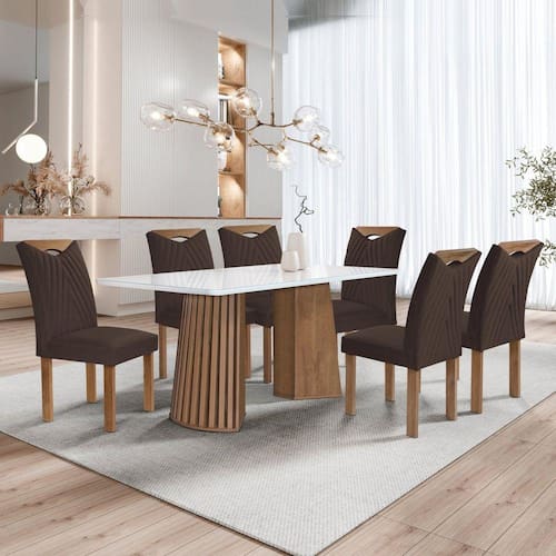Renove sua sala de jantar com o conjunto Mesa Stella, acompanhado por seis cadeiras. A mesa tem um visual moderno, com linhas suaves e elegantes. As cadeiras são confortáveis e têm um estilo sofisticado. Juntos, eles fazem da sua sala de jantar um lugar especial para reunir a família e os amigos. Medida da Mesa (A x L x P): 79cmx170cmx90cm Peso da Mesa: 69,5 kg Mesa suporta até: 40.0000 Acabamento da Cadeira/Banco: Pintura Acabamento da Mesa: Pintura UV Acompanha Manual de Instalação: Sim Almofada do assento: Fixa Ambiente Principal: Sala de Jantar Cadeira/Banco estofada: Encosto e Assento Estofados Cadeira/Banco Estofada: Encosto e Assento Estofados Cadeira/Banco suporta até: 120.0000 codigo_ean: 7909903599006 Complexidade da Montagem: Alta: deve ser montado por um montador especializado Cor: Chocolate/Off White/Veludo Marrom Cor do Produto: Chocolate/Off White/Veludo Marrom De Canto (Canto Alemão): Não Design da Base: Cilindro Enchimento do Assento: Espuma D-23 Enchimento do Encosto: Espuma D-20 Escala de Brilho: Fosco Espessura do Tampo: 29 mm Estrutura do Assento: MDF Estrutura do Encosto: MDF Formato do Tampo: Retangular Itens Inclusos: 1 Mesa Stella com 6 cadeiras e manual de montagem Linha ou Coleção: Stella Manual de Montagem e Instalação: https://product-hub-prd.madeiramadeira.com.br/895883/documents/c09f2b50-c271-47ab-abbb-f69fb08df429A20NEVADA20CADEIRA20NEVADA.pdf Material da Base da Mesa: MDF Material da Estrutura da Cadeira: MDF Material do Tampo: Vidro/MDF Material Principal: MDF Material Principal das Cadeiras/Bancos: MDF Medida da Cadeira/Banco (A x L x P): 96,5cmx56cmx44cm Medida do Tampo (L x C x E): 170cmx90cmx2,9cm Mesa Dobrável: Não Mesa Extensível: Não Necessita Montagem: Sim Origem do Produto: Nacional Peso da Cadeira/Banco: 9,1 kg Possui Apoio para Braços: Não Possui Apoio Para os Pés: Não Possui Prateleiras: Não Possui Suporte Giratório: Não Possui Vidro: Sim Quantidade de Cadeiras: 6 Quantidade de Lugares: 06 Recomendações de Uso, Manutenção e Limpeza: Limpar apenas com pano úmido. Revestimento da Cadeira/Banco: Veludo Sistema de Montagem: Parafusos Tipo de Assento: Fixo Tipo de Encosto: Fixo