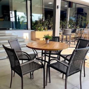 Combinando sofisticação e resistência, esta cadeira de alumínio com fibra sintética é ideal para ambientes externos. A mesa de madeira completa o conjunto, oferecendo durabilidade e elegância.