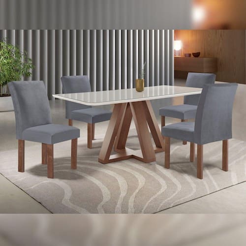 Conjunto Mesa Tampo Smart Plus Vidro Kyra 120cmx90cm 4 Cadeiras Canela Chocolate/Off White/Suede Cinza