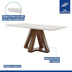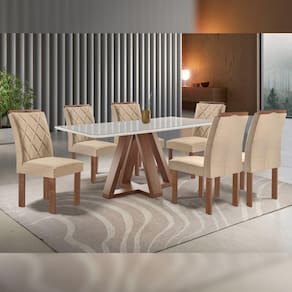 Com um design versátil e fabricação de alta qualidade, este é o conjunto que a sua casa merece. A mesa Kyra com 6 cadeiras Arthus são perfeitas para qualquer ambiente de sala de jantar, seja ele clássico, contemporâneo ou moderno. Com tampo de vidro/MDF e cadeira estofada e confortável, receber os amigos e família para compartilhar as refeições se torna momentos memoráveis. Medida da Mesa (A x L x P): 79cmx170cmx90cm Peso da Mesa: 55 kg Mesa suporta até: 30.0000 Acabamento da Cadeira/Banco: Pintura Acabamento da Mesa: Pintura UV Almofada do assento: Fixa Ambiente Principal: Sala de Jantar Apoio para Braços Estofado: Não Cadeira/Banco estofada: Encosto e Assento Estofados Cadeira/Banco suporta até: 120.0000 codigo_ean: 7909903351055 Complexidade da Montagem: Média: pode ser montado por mais de uma pessoa e/ou necessite de maior conhecimento para montagem Cor: Chocolate/Off White/Suede Cru Cor do Produto: Chocolate/Off White/Suede Cru De Canto (Canto Alemão): Não Enchimento do Assento: Espuma D-23 Enchimento do Encosto: Espuma D-20 Escala de Brilho: Fosco Espessura do Tampo: 29 mm Estrutura do Assento: MDF Formato do Tampo: Retangular Itens Inclusos: 1 Mesa, 6 Cadeiras, kit ferragens e manual de montagem Linha ou Coleção: Kyra/Arthus Manual de Montagem e Instalação: https://product-hub-prd.madeiramadeira.com.br/855060/documents/f01d075e-f8da-4150-806c-9e8501a33f5b1387744manualdemontagem.pdf Manutenção: Limpeza com pano macio e levemente umedecido. Não utilizar solventes a base e de inflamáveis. Não utilizar produtos abrasivos. Material da Base da Mesa: MDF Material da Estrutura da Cadeira: MDF Material do Tampo: Vidro/MDF Medida da Base (A x L x P): 77cmx94cmx67cm Medida da Cadeira/Banco (A x L x P): 97,5cmx44cmx58cm Medida do Tampo (L x C x E): 170cmx90cmx29mm Mesa Extensível: Não Necessita Montagem: Sim Origem do Produto: Nacional Peso da Cadeira/Banco: 9 kg Possui Apoio para Braços: Não Possui Apoio Para os Pés: Não Possui Suporte Giratório: Não Quantidade de Cadeiras: 6 Quantidade de Lugares: 06 Recomendações de Uso, Manutenção e Limpeza: Limpeza com pano macio e levemente umedecido. Não utilizar solventes a base e de inflamáveis. Não utilizar produtos abrasivos. Revestimento da Cadeira/Banco: Suede Sistema de Montagem: Parafusos Vidro Temperado: Sim
