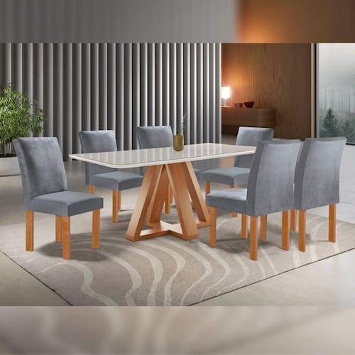 Conjunto Mesa Tampo Smart Plus Vidro Kyra 170cmx90cm 6 Cadeiras Canela Cinamomo/Off White/Suede Cinza