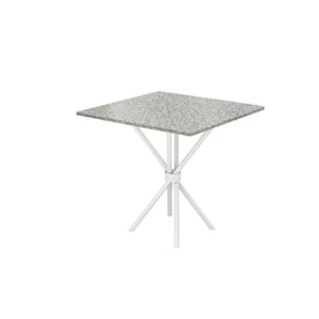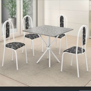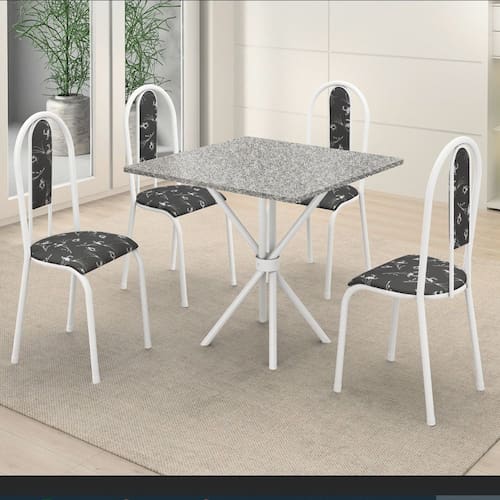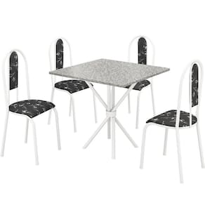 Conjunto de mesa tubular com 04 cadeiras Berlim em tubo 7/8" branco com estofado em courino preto floral, base tubular de 1 1/4" e tampo de 0,75x0,75 em granito ocre.