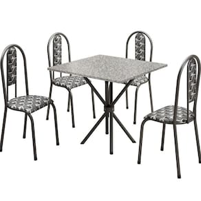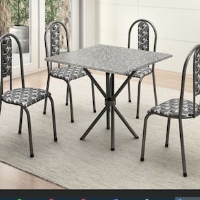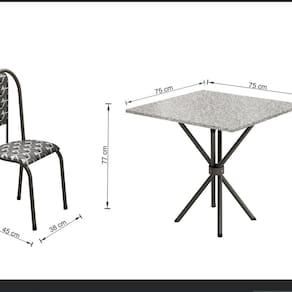 Ideal para sua cozinha, trazendo utilidade e praticidade para seu dia a dia. Acabamento da Cadeira/Banco: Pintura Epóxi Acabamento da Mesa: Pintura Epóxi Ambiente Principal: Cozinha Cadeira/Banco estofada: Sim Cadeira/Banco suporta até: 90 kg Complexidade da Montagem: Baixa: pode ser montado por uma pessoa sozinha Cor: Prata Matelado/ Branco Preto Ocre Cor da Base: Prata Cor do Produto: Prata Matelado/ Branco Preto Ocre Cor do Tampo: Cinza Enchimento do Assento: Espuma D-10 Escala de Brilho: Brilhante Espessura do Tampo: 20 mm Estrutura do Assento: compensado Itens Inclusos: 01 caixa com 04 cadeiras/01 caixa de base/01 tampo Manual de Montagem e Instalação: https://cdn2.madeiramadeira.com.br/atributo/bm-moveis-tubulares/1951963-1534-17157124809854.pdf Material da Base da Mesa: Aço Carbono Material da Estrutura da Cadeira: Aço Carbono Medida da Cadeira/Banco (A x L x P): 95x45x38 Medida da Mesa (A x L x P): 77X75X75 Medida do Tampo (L x C x E): 75x75x2 Mesa suporta até: 20 kg Necessita Montagem: Sim Origem do Produto: Nacional Peso da Cadeira/Banco: 4 kg Peso da Mesa: 4 kg Possui Apoio Para os Pés: Não Recomendações de Uso, Manutenção e Limpeza: somente com pano levemente umidecido com água Revestimento da Cadeira/Banco: Courino Sistema de Montagem: parafusado