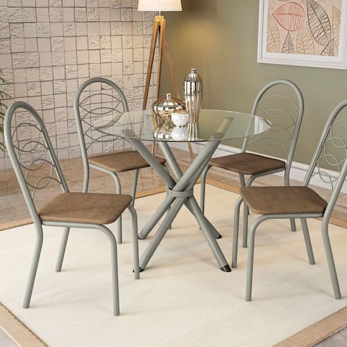 Para ambientes modernos, o conjunto CMC683 da Kappesberg é a melhor opção. Em estrutura metálica pintada com tinta epóxi na cor níquel, a mesa possui um design único, com destaque para a disposição dos pés, unidos por um anel central. Medindo 75cm de altura e 73cm de largura e profundidade, combinada ao tampo de vidro redondo e transparente TAV9561, com 6mm de espessura, ela acomoda até quatro pessoas. Já as cadeiras, no modelo Holanda, também em estrutura metálica pintada na cor níquel, medindo 91,8cm de altura, sendo 46cm a altura do assento, suportam até 130kg, garantindo estabilidade e resistência. E para mais comodidade, o assento é estofado e recoberto em sintético na cor capuccino. Já o encosto, enclinado, conta com detalhes em aramado, que proporcionam um melhor acabamento e conforto.