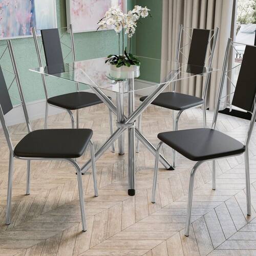 Para ambientes modernos, o conjunto CMC683 da Kappesberg é a melhor opção. Em estrutura metálica cromada, a mesa possui um design único, com destaque para a disposição dos pés, unidos por um anel central. Medindo 75cm de altura e 73cm de largura e profundidade, combinada ao tampo de vidro quadrado e transparente TAV9061, com 6mm de espessura, ela acomoda até quatro pessoas. Já as cadeiras, no modelo Lisboa, também em estrutura metálica cromada, medindo 99cm de altura, sendo 46cm a altura do assento, suportam até 130kg, garantindo estabilidade e segurança. E para mais comodidade, o assento é estofado e recoberto com sintético na cor preta. Já o encosto, com detalhe central estofado, possui acabamento reto e detalhes em aramado, proporcionando um diferencial único.