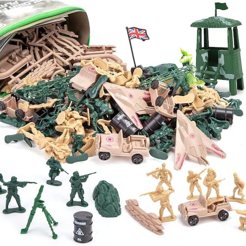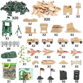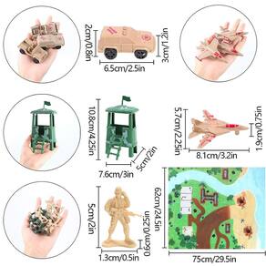 Conjunto de soldado de brinquedo, 120 peças - Pacote de super valor – 40 peças de soldados de brinquedo, 1 tapete de brinquedo, 8 peças, 8 aeronaves de combate, além de uma variedade de equipamentos militares e uma variedade de acessórios de campo de batalha (120 peças no total) - Detalhes do produto: nossos homens do exército de plástico estão em duas cores diferentes, um grupo em verde e outro em cáqui, cada soldado de brinquedo tem cerca de 5 cm x 1,3 cm x 0,6 cm. O tapete tem cerca de 75 x 62 cm. Você pode colocar dois campos no tapete e colocar as tropas para uma grande luta! - Seguro para crianças – Todos os nossos brinquedos do exército são feitos de plástico de alta qualidade, resistente e firme, inodoro e livre de BPA. Não é fácil de quebrar, durável e reutilizável. Nossos bonecos do exército em miniatura passaram por um rigoroso processo de teste e certificação, 100% seguro para crianças. - Menos tempo de tela: nosso conjunto de brinquedos de plástico para homens do exército pode estimular a imaginação das crianças; mantê-las efetivamente longe de dispositivos eletrônicos; deixe-as ocupadas por horas. Quantidade total de acessórios de brinquedo de até 120 peças, sem necessidade de adereços extras, pacote valioso. Uma bolsa com zíper anexada para facilitar o armazenamento após o uso, sem mais peças faltando e nunca deixará bagunça no seu pequeno. - VÁRIAS OCASIÕES - O conjunto militar de brinquedo é perfeito como presente de Natal, Ação de Graças e aniversário para crianças. Brinquedos adequados para brincadeiras, projetos escolares, para ensinar as crianças sobre conflitos históricos de maneira envolvente, modelos de batalha para decoração, etc.