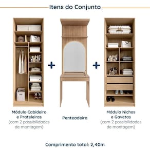 Conjunto Modulado 3 Peças Nichos com 2 Gavetas, Penteadeira e Cabideiro Joy CabeCasa MadeiraMadeira Verde. O guarda roupas Joy CabeCasa foi desenvolvido para trazer a experiência de ter seu guarda roupas planejado por uma personal organizer. O móvel possui prateleiras reguláveis e removíveis que se adaptam a diversas necessidades. Conta também com um kit que pode conter gabaritos de dobra para roupas, separadores de cabides e adesivos para identificar todos os espaços. Pensado para quem precisa de um espaço só seu o módulo de Penteadeira possui espaços para organizar perfumes, maquiagens e acessórios, o móvel conta com espelho iluminado a LED e tampo em vidro temperado, para facilitar a organização dos seus acessórios dentro da gaveta sem a necessidade de abri-la. Além disso, tem design atual e alinhado as suas tendências que irão trazer muito mais sofisticação e aconchego para a decoração.