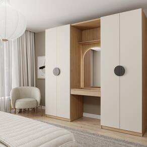 Conjunto Modulado Joy 3 Peças Módulo Nichos com 2 Gavetas, Penteadeira com Espelho e Cabideiro com Nichos Cabecasa Madeiramadeira Cinza Sereno/Avena. O guarda roupas Joy CabeCasa foi desenvolvido para trazer a experiência de ter seu guarda roupas planejado por uma personal organizer. O móvel possui prateleiras reguláveis e removíveis que se adaptam a diversas necessidades. Conta também com um kit que pode conter gabaritos de dobra para roupas, separadores de cabides e adesivos para identificar todos os espaços. Pensado para quem precisa de um espaço só seu o módulo de Penteadeira possui espaços para organizar perfumes, maquiagens e acessórios, o móvel conta com espelho iluminado a LED e tampo em vidro temperado, para facilitar a organização dos seus acessórios dentro da gaveta sem a necessidade de abri-la. Além disso, tem design atual e alinhado as suas tendências que irão trazer muito mais sofisticação e aconchego para a decoração.