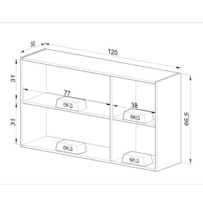 As dimensões estão expressas na seguinte forma - Largura x Altura e Profundidade em cm. O peso suportado considera a carga distribuída igualmente pela peça.
