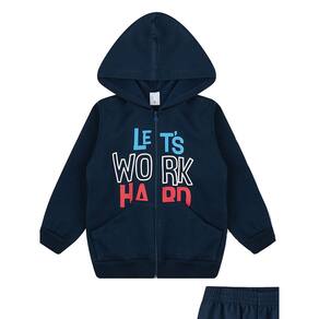 Conjunto infantil composto por uma jaqueta com capuz e uma calça.