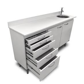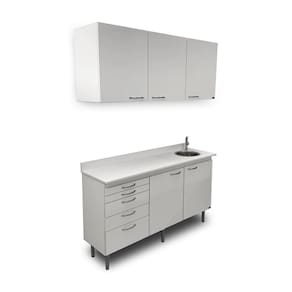 Características: Pia em aço INOX 25cm de diâmetro internamente, não acumula sujeira e possui alta resistência a corrosão Puxadores em metal cromado 128mm extremamente resistentes Gavetas com corrediça telescópica, que garantem abertura total da gaveta, maior tempo de vida útil e maior resistência ao peso Fácil limpeza e desinfecção da superfície do móvel As prateleiras do modulo inferior são ajustáveis Fabricado 100% em MDF Branco TX (Textura levemente granulada de brilho discreto)