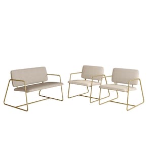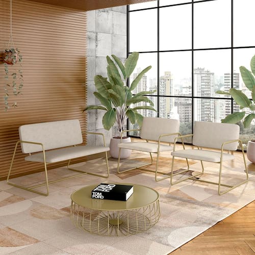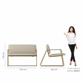 Detalhes Técnicos - Assento e Encosto Tapeçados, Estofados e Fixos - Espuma do Assento e do Encosto: D20 - Tonalidade: Dourado/Suede Bege - Material: Metalon - Medida Poltrona Namoradeira: A:75CM x L:104CM x P:85CM - Medida do chão até o assento: 45cm de altura - Poltrona e Namoradeira suporta até 120KG (cada) - Montagem: Difícil - Medida Poltronas: A:75CM x L:68CM x P:85CM - Medida do chão até o assento: 45cm de altura - Montagem: Difícil