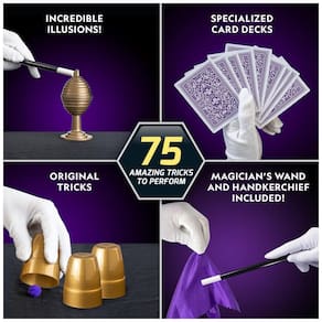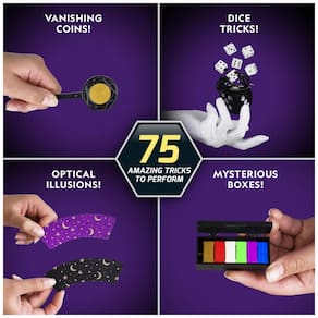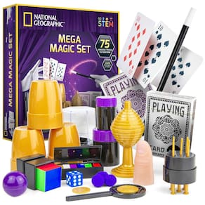 DESCUBRA O MUNDO DA MÁGICA Com este kit incrível, as crianças aprenderão os segredos por trás de truques clássicos, incluindo ilusões com copos e bolas, um polegar falso, a bola e o vaso, uma caixa de ilusão, um estojo de moeda misterioso e, claro, a icônica varinha mágica.