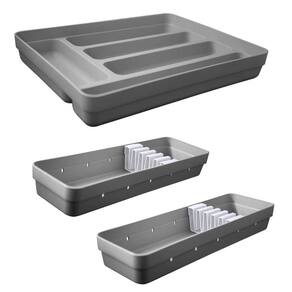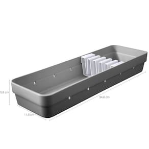 O conjunto organizador de talheres e facas da OU é perfeito para organizar suas gavetas de talheres. Com 5 segmentações, o organizador de talheres permite segmentar os talheres de forma visual, simples e prática, mantendo-os limpos e protegidos. Já os organizadores de facas possuem segmentações para 5 facas (cada), permitindo organizar as facas de forma visual e segura, além de preservar o fio. Os produtos são fabricados em material texturizado (polipropileno) na cor chumbo diminuindo a aparecimento de riscos e aranhões. Além de possuir cantos arredondados que não acumulam sujeira e facilitam a higienização.