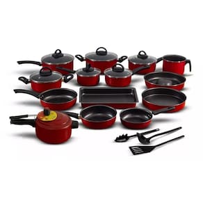 Vantagem: - os acessórios incluídos neste conjunto são feitos de nylon e por isso melhoram a durabilidade do antiaderente. Peças incluídas no conjunto: 01 panela 04 panelas 02 caçarolas 03 frigideiras fundas 01 fervedor 03 formas 03 acessórios Descrição das peças: 01 panela Capacidade: 3l Diâmetro: 18cm Altura: 12cm 01 panela Capacidade: 2,7 l Diâmetro: 20 cm Altura: 8 cm 01 panela Capacidade: 2 l Diâmetro: 18 cm Altura: 7 cm 01 panela Capacidade: 1,5 l Diâmetro: 16 cm Altura: 7 cm 01 panela Capacidade: 0,6 l Diâmetro: 14 cm Altura: 5 cm 01 caçarola Capacidade: 2,7 l Diâmetro: 20 cm Altura: 8 cm 01 caçarola Capacidade: 1,3 l Diâmetro: 16 cm Altura: 7 cm 01 frigideira funda Capacidade: 1,6 l Diâmetro: 20 cm Altura: 6 cm 01 frigideira funda Capacidade: 1,4 l Diâmetro: 18 cm Altura: 6 cm 01 frigideira funda Capacidade: 1l Diâmetro: 16 cm Altura: 5 cm 01 fervedor Capacidade: 2 l Diâmetro: 14 cm Altura: 12 cm 01 forma redonda de 25cm 01 forma de pudim ou bolo de 25cm 01 forma retangular de 27cm x 22cm 03 acessórios vão 3 dos acessórios abaixo. Podem variar, não tem como escolher - colher de arroz - espátula - concha - pegador de macarrão - escumadeira : 3 meses contra defeito de fabricação e não cobre má utilização. Embalagem: os produtos vêm numa caixa parda reciclada. Nós colaboramos com o meio ambiente utilizando caixas recicladas para transporte. do vendedor: 3 meses Marca: Não Informado Ean: 7896773531734
