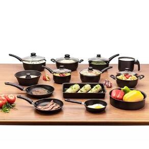 Conjunto de panelas 13 peças Comprar um conjunto de panelas é uma ótima opção para quem quer trocar os utensílios da cozinha e economizar. Tudo de forma vantajosa, você terá; praticidade, harmonização da cozinha e variedade de produtos. O conjunto possuí 13 panelas antiaderentes que facilitam o momento de cozimento, pois impede que a comida grude, e auxilia na limpeza do item também. Ideal para quem está se mudando para um local novo, indo morar sozinho ou está apenas renovando o armário de panelas, o conjunto será uma ótima escolha. Torne sua cozinha ainda mais equipada para que você possa realizar todas suas receitas preferidas. Além disso, as panelas são leves, permitindo que você leve-as onde for, incluindo reuniões entre a família ou amigos, para preparar aquela deliciosa refeição. O material de alumínio auxilia no momento de cozimento, fazendo com que a comida fique pronta rapidamente, a panela possuí também cabos de baquelite, que diminuem a chance de acidentes com queimaduras.