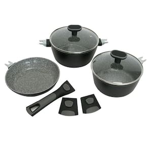 O conjunto é composto por uma panela com tampa diâmetro 18cm, altura 8 cm, capacidade 2 L , uma caçarola com tampa diâmetro 20cm, altura 9 cm, capacidade 2.8 L , uma frigideira diâmetro 20cm, altura 4,5 cm, capacidade 1.2 L , uma espátula 21,5 x 4,5 x 1 cm e uma meia espátula 21,5 x 4,5 x 1 cm . Também acompanha 3 cabos removíveis.