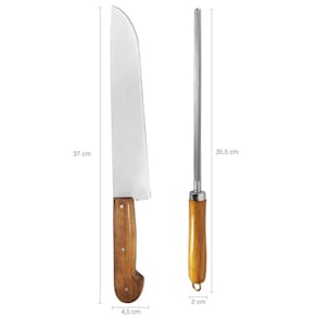 Garantia: 90 dias / Peso: 620g / Cor: Marrom, Bege e Carbono / Ref: 4010CM Dimensões da Faca: 37cm (C) x 4,5cm (L) x 2cm (A). Dimensões da Chaira: 35,5cm (C) x 2cm (L) x 2cm (A). Dimensões da Bainha: 41,5cm (C) Dimensões da Bainha Largura Superior: 21,5cm (L) Dimensões da Bainha Largura Inferior:7,5cm (L) Lâmina: 2mm Espessura / Comprimento 25cm / Polegadas: 10' Cuidados: Não guardar molhada ou suja na bainha. Para melhor conservação da aparência, passar óleo mineral na lâmina antes de guardar. *Por serem produzidas artesanalmente, as tonalidades dos cabos das facas variam de acordo com a matéria prima, tornando-as assim, cada faca única.