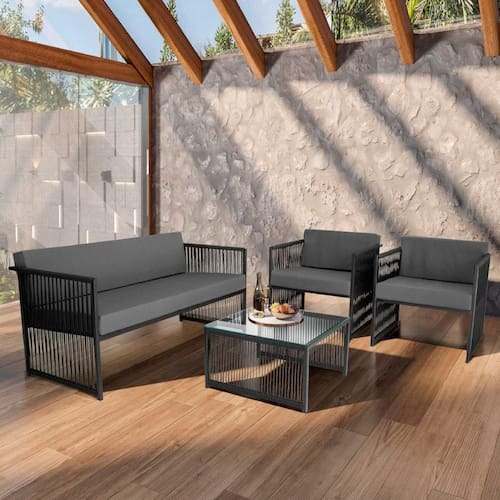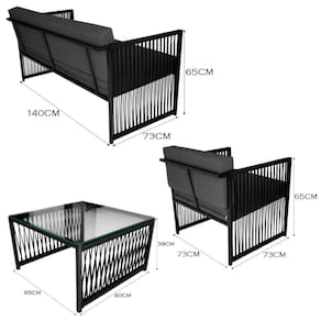 Conjunto Para área Externa De Corda Náutica Preto/cinza O Conjunto Santiago oferece nao apenas um visual sofisticado, mas tambem durabilidade, resistencia e conforto, tornando-o uma escolha versatil e atraente para diferentes espacos e ambientes. Fabricado com estrutura em Aco Carbono, proporcionando resistencia e durabilidade. O acabamento em Corda Nautica confere um toque de elegancia, combinando perfeitamente com diferentes estilos de decoracao, enquanto o vidro na mesa de centro adiciona um toque moderno e funcional. Os assentos e encostos das poltronas e da namoradeira sao estofados com material Impermeavel e espuma D28 o que proporciona uma sensacao de suavidade ao sentar-se. ESPECIFICACOES TECNICAS: - Material: Aco Carbono; - Material do Assento: Espuma D28; - Material do Encosto: Espuma D28; - Acabamento: Corda Nautica; - Impermeavel: Sim; - Possui Tampo? Sim; - Possui Vidro? Sim; - Quantidade de Poltrona: 2 Poltronas; - Quantidade de Namoradeira: 1 Namoradeira; - Produto Precisa de Montagem? (Sim/Nao): Nao; - Peso Total Suportado: 150kg; - Garantia: 3 Meses; - Instrucoes de Cuidado: Limpar com pano umedecido e sabao neutro; - Dimensoes do Produto (LarguraXProfundidadeXAltura) Mesa: 60x60cm / Poltrona: 60x73x65cm / Namoradeira: 140x73x65cm - Conteudo da Embalagem: (01 Mesa de Centro, 02 Poltronas e 01 Namoradeira); Marca: Kit Home