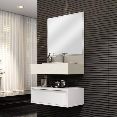 Gaveteiro em MDP BP (15 e 25mm), com puxador de alumínio anodizado. Possui gaveta com corrediças telescópicas e amortecedor slow, que proporciona fechamento suave da mesma, acompanha higiênico organizador de escovas e produtos dentais (removível e lavável). Além disso, possui gaveta interna com divisões e fundo revestido com manta antiderrapante. Espelho Cristal 03 mm com acabamento bisotê, estruturado em painel de MDF. A bancada para Banheiro é fabricada em porcelanato técnico polido, acompanha cuba de louça embutida, mais frontão frontal e frontão lateral. Ideal para compor com os gaveteiros Max 80 da marca Bumi Móveis. * Não acompanha torneiras e acessórios.