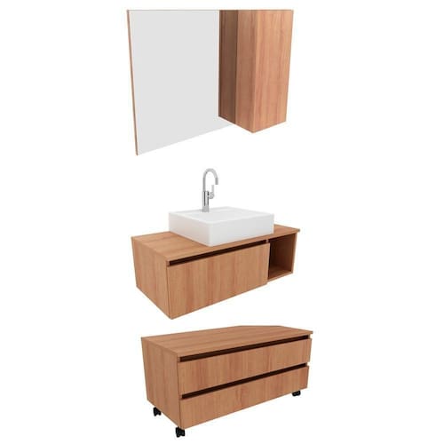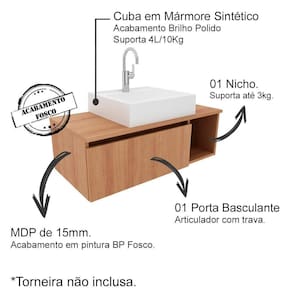 Conjunto Para Banheiro 04 Peças. Com design prático e funcional, estas peças entrega ao ambiente toques de modernidade e elegância. Possuem estruta em MDP de 15mm, e acabamento em pintura UV/BP. Composto por 01 porta na lateral do espelho com dobradiças metálicas e 3 nichos internos, espelho ja fixado no painel, 01 porta basculante com dobradiças metálicas e articulador com trava, 01 nicho, 02 gavetas com corrediças metálicas, gabinete conta com 04 rodízios para tornar mais pratica sua rotina. Cuba em mármore sintético e acabamento Brilho Polido, esta Cuba já vai com furação para intalação da torneira (torneira não inclusa). O mármore sintético combina alta resistência ao impacto e baixa porosidade, proporcionando maior impermeabilidade a manchas, o que garante a resistência e vitalidade do produto. Este conjunto é uma ótima escolha para manter seus produtos de higiene e beleza sempre organizados. Estes produtos chegarão na sua casa separados em 04 volumes.
