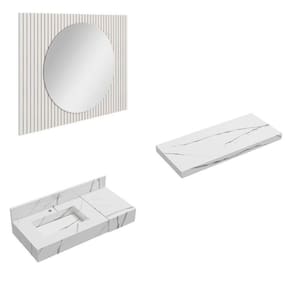 O CONJUNTO é composto por PRATELEIRA + ESPELHO + BANCADA. PRATELEIRA fábricada em porcelanato, com baixíssima absorção de umidade, resistente a riscos e manchas. ESPELHO redondo de 70cm x 70xm com acabamento lapidado, estruturado em painel com ripas autêntica de HDF BP (06mm). BANCADA com cuba esculpida, fábricada em porcelanato, com baixíssima absorção de umidade, resistente a riscos e manchas; possuí uma área seca ao lado. Espelho acompanha tapa furos + parafusos + buchas de nylon para fixação na parede. Prateleira e Bancada acompanham cantoneiras metálicas + parafusos + buchas de fixação; e bancada com válvula na cuba para escoamento da água. Possui manual de instalação. Produtos saem montados de fábrica, devidamente regulados, bastando apenas fixá-los na parede. Garantia de 12 meses Altura do Conjunto: 80 cm Ambiente: null Ambiente Principal: Banheiro Cor: Branco Informação Complementar: 1x Bancada em Porcelanato 100cm com Cuba Esculpida Ripy Calacata Largura: 100 cm Altura: 14,5 cm Peso: 29,8 kg Profundidade: 45 cm Necessita Montagem: Não