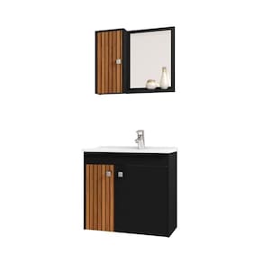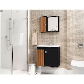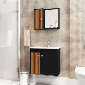 Armário superior, espelheira e gabinete, elaborado em MDF com espessura de 12 mm.