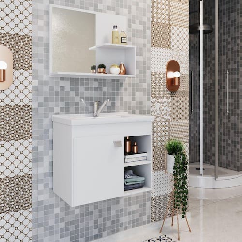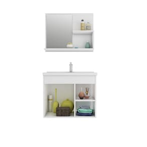 O conjunto para banheiro Bia é perfeito para você que busca por qualidade e modernidade para seu lar. Produzido em MDF com pintura ultravioleta o conjunto é composto por 1 balcão suspenso com 1 porta de bater com puxador em ABS e 1 prateleira e 1 espelheira com 2 prateleiras para organização de produtos e pertences. O grande diferencial do conjunto fica por conta da cuba em mármore sintético que acompanha o produto. Modelo suporta o peso máximo de 20kg.