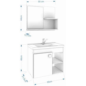 Estrutura em MDF de 12mm Pintura UV Possui cuba com medidas 10 x 545 x 313 em mármore sintético Não possui tampo Possui espelho tiporeflecta de 3mm 1 porta do tipo bater Dobradiças de metal Puxador em ABS pintado 2 Nichos 2 Prateleiras Não possui pés produto deve ser fixado a parede suporta até 02 kg Para limpeza não utilizar álcool materiais abrasivos ou qualquer produto que possa danificar o móvel.
