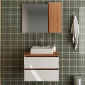 Conjunto Para Banheiro 03 Peças. Com design prático e funcional, estas peças ao ambiente toques de modernidade e elegância. Possuem estruta em MDP de 15mm, e acabamento em pintura UV/BP. Gabinete com 02 gavetas com corrediças metálicas, espelheira com 01 porta na lateral com dobradiças metálicas, 3 nichos internos para tornar mais pratica sua rotina, conta com espelho ja fixado no painel. Cuba em mármore sintético e acabamento Brilho Polido, esta Cuba já vai com furação para intalação da torneira (torneira não inclusa). O mármore sintético combina alta resistência ao impacto e baixa porosidade, proporcionando maior impermeabilidade a manchas, o que garante a resistência e vitalidade do produto. Este conjunto é uma ótima escolha para manter seus produtos de higiene e beleza sempre organizados. Estes produtos chegarão na sua casa separados em 03 volumes.