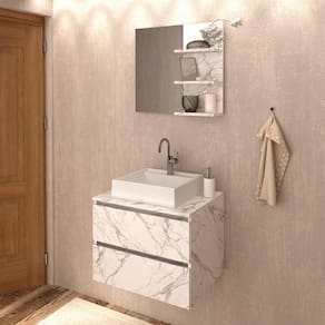 Conjunto Para Banheiro 03 Peças. Com design prático e funcional, estas peças ao ambiente toques de modernidade e elegância. Possuem estruta em MDP de 15mm, e acabamento em pintura UV/BP. Composto por 02 gavetas com corrediças metálicas, 03 prateleiras para deixar seus itens mais utilizados sempre a mão. Cuba em mármore sintético e acabamento Brilho Polido, esta Cuba já vai com furação para intalação da torneira (torneira não inclusa). O mármore sintético combina alta resistência ao impacto e baixa porosidade, proporcionando maior impermeabilidade a manchas, o que garante a resistência e vitalidade do produto. Este conjunto é uma ótima escolha para manter seus produtos de higiene e beleza sempre organizados. Estes produtos chegarão na sua casa separados em 03 volumes.