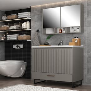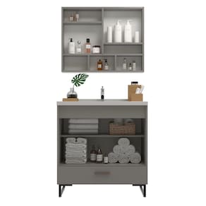 O conjunto gabinete para banheiro nevada de 80cm, composto por uma espelheira grande com duas portas de abrir, composta por um nicho na parte inferior e um amplo espaço interno. Um gabinete super espaçoso, com uma gaveta grande e duas portas com detalhe em ripado, tem dobradiças com amortecimento que fecham as portas suavemente, sem bater e fazer barulho. Design único e características que garantem melhor e maior durabilidade ao produto, o detalhe em ripado dá um charme a mais no seu conjunto, uma gaveta inferior com trilhos telescópicos que deslizam ao abrir e fechar, e charme especial, é o pé, sendo o tubo metálico. Acabamento da Cuba: Polido Acabamento da Gaveta: PVC Acabamento da Porta: PVC Acabamento da Prateleira: PVC Acabamento dos Pés: Pintura Acompanha Cuba: Sim Acompanha Gaveteiro: Sim Acompanha Manual de Instalação: Sim Acompanha Parafusos Para Fixação Na Parede: Não Acompanha Tampo: Sim Acompanha Válvula: Não Altura dos Pés: 7 cm Altura Máxima dos Pés: 7.0000 Ambiente Principal: Banheiro codigo_ean: 7900288167347 Complexidade da Montagem: Baixa: pode ser montado por uma pessoa sozinha Cor: Cimento Cor da Cuba: Branco Cor do Produto: Cimento Escala de Brilho: Fosco Escala de Brilho da Gaveta: Fosco Escala de Brilho da Porta: Fosco Escala de Brilho da Prateleira: Fosco Espessura do Espelho: 3 mm Formato da Cuba: Retangular Formato do Espelho: Quadrado Formato Espelheira: Retangular Furação para Cuba e Torneira: Sim Gaveta com Chave: Não Itens Inclusos: 1 Gabinete, 1 Espelheira, Manual de Montagem e Kit Ferragens Linha ou Coleção: Nevada Manual de Montagem e Instalação: https://product-hub-prd.madeiramadeira.com.br/675740262/documents/de31c1c5-a7af-423e-8528-4a7c3032e6ed298159856651749154829288.pdf Marca: Belizze Material da Cuba: Mármore Sintético Material da Gaveta: MDF Material da Porta: MDF Material da Prateleira: MDF Material do Puxador da Gaveta: Poliestireno Material do Tampo: Mármore Sintético Material dos Pés: Metal Material Principal: MDF Medida da Cuba (C x L x P): 7x40x78,5 Medida da Espelheira (A x L x P): 68x80x1,2 Medida do Gabinete (A x L x P): 83x80x44 Necessita Montagem: Sim Origem do Produto: Nacional Pés Reguláveis: Não Peso: 52,9 kg Peso Máximo por Gaveta: 20 kg Peso Máximo por Prateleira: 20 kg Possui Espelheira: Sim Possui Gabinete: Sim Possui iluminação: Não Possui Pés: 02 Possui Porta de Vidro: Não Possui Recorte No Tampo Para Cuba: Sim Possui Rodízio: Não Possui Sifão: Não Possui Tampo: Sim Possui Tampo de Vidro: Não Produto Montado: Sim Quantidade de Espelhos: 02 Espelhos com Tamanhos Iguais Recomendações de Uso, Manutenção e Limpeza: Retire o pó com uma flanela seca e depois utilize um pano macio umedecido com água. Não utilizar produtos químicos e abrasivos. Sapatas Niveladoras: Não Sistema de Montagem: Parafuso Suporte para Toalheiro: Não Tamanho do Espelho (A x L): 68x80 Tamanho do Gabinete: Médio: de 60cm a 80cm de largura Tipo de Corrediça da Gaveta: Metálica Telescópica Tipo de Cuba: Embutir Tipo de Dobradiça/Corrediça da Porta: Com Amortecedor Tipo de Fixação do Espelho: Fita Dupla Face Tipo de Gabinete: Gabinete de Chão Tipo de Gaveta: Interna Tipo de Porta: Abrir Tipo de Puxador da Gaveta: Externo Tipo de Puxador da Porta: Não Contém