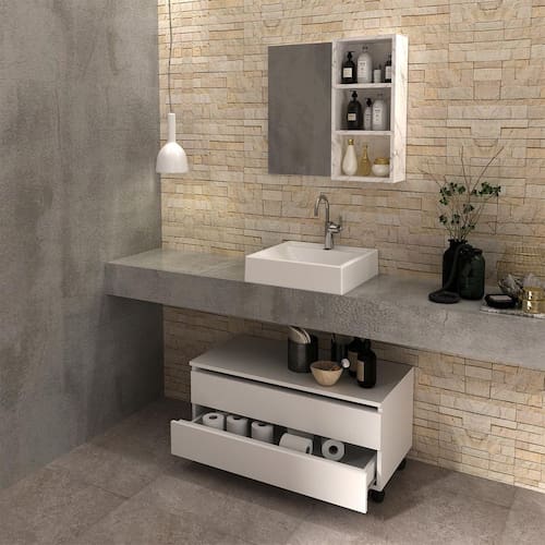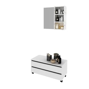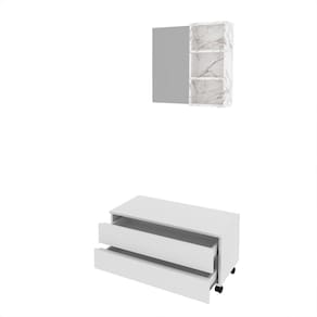CARACTERÍSTICAS TÉCNICAS: - Produzida em MDP de 15 mm - Acabamento UV na cor Branco e Mármore Branco - Acompanha Espelho - 2 Gavetas com Corrediças Metálicas - Puxador tipo Cava - Balcão com Rodízios *Cuba NÃO incluso, apenas demonstrativo *Kit Composto por Gabinete com Rodízios (3603) e Espelheira (3609)