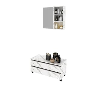 CARACTERÍSTICAS TÉCNICAS: - Produzida em MDP de 15 mm - Acabamento UV na cor Mármore Branco - Acompanha Espelho - 2 Gavetas com Corrediças Metálicas - Puxador tipo Cava - Balcão com Rodízios *Cuba NÃO incluso, apenas demonstrativo *Kit Composto por Gabinete com Rodízios (3603) e Espelheira (3609)