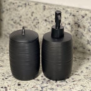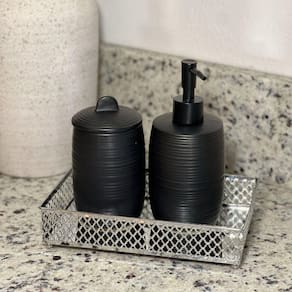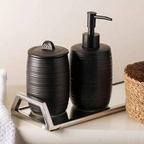Conjunto Para Banheiro Em Cerâmica Duna Com 2 Peças Wolff Preto Conjunto Para Banheiro Em Cerâmica Duna Com 2 Peças Wolff Preto - Características Gerais do Produto: - Dimensões: Porta Sabonete Líquido 8x18cm | Recipiente para Armazenamento 8x14cm - Capacidade: 450ml - Material Principal: Cerâmica - Linha: Duna - Informações Adicionais: Lavar com detergente neutro, esponja macia e secar imediatamente;