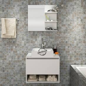 Conjunto Para Banheiro. Com design prático e funcional, estas peças ao ambiente toques de modernidade e elegância. Possuem estruta em MDP de 15mm, e acabamento em pintura UV/BP. Gabinete possui 01 porta basculante com dobradiças metálicas e articulador com trava, 01 nicho, espelheira com 03 prateleiras para tornar sua rotina mais pratica, espelho ja fixado no painel, gabinete suspenso ideal para cuba de apoio (cuba não inclusa). Este conjunto é uma ótima escolha para manter seus produtos de higiene e beleza sempre organizados. Estes produtos chegarão na sua casa separados em 02 volumes.
