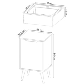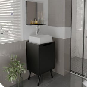 Conjunto Para Banheiro Gabinete Com Cuba e Espelheira, ideal para inovar o seu banheiro com toque luxuoso e ao mesmo tempo refinado. Gabinete e Espelho com estrutura em MDP de 15mm, proporcionando maior durabilidade e resistência a peça, contando com acabamento revestido em BP (semi - brilho). Composto por 1 porta com dobradiças metálicas, 1 prateleira com amplo espaço para armazenar diversos itens e 4 pés retro palito. Suportando 10kg o tampo e 3kg a prateleira. Espelho com design retangular e 1 prateleira com amplo espaço para armazenar itens, prateleira suporta 3kg. Cuba produzida em mármore sintético, contando com acabamento em brilho polido. Suportando até 4 litros e 10kg. Possui furação para instalação de torneira (torneira não inclusa). Perfeito para deixar seu ambiente produtivo, proporcionando uma ambientação elegante e moderna. Estes móveis chegarão na sua casa separados em 3 volumes.