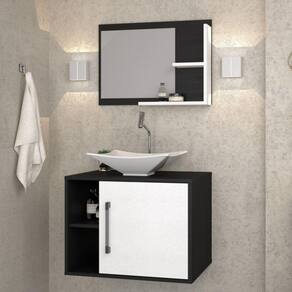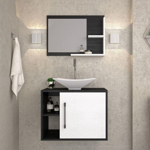 O Conjunto Balcão com Cuba e Espelheira Laura 600 KTLR600 tem design compacto, perfeito para pequenos espaços, conta com uma prateleira lateral e uma cuba de apoio, além da espelheira. Possui fitas de borda em PVC com colagem PUR, garantindo maior durabilidade ao seu móvel. Acabamento: BP Acetinado Acabamento da Cuba: Gel Acabamento da Porta: BP Acetinado Acabamento da Prateleira: BP Acetinado Acompanha Cuba: Sim Acompanha Tampo: Sim Altura: 45 cm calculo: unidade Complexidade da Montagem: Média: pode ser montado por mais de uma pessoa e/ou necessite de maior conhecimento para montagem Cr: Preto Ônix/Branco Chess Cr da Cuba: Branco Cr do Produto: Preto Ônix/Branco Chess Cr Interna: Preto Escala de Brilho: Fosco Escala de Brilho da Porta: Fosco Escala de Brilho da Prateleira: Fosco Espessura do Espelho: 3 mm Estilo: Contemporâneo Formato do Espelho: Retangular Furação para Cuba e Torneira: Não Itens Inclusos: 1 Gabinete com Cuba, 1 Espelheira, kit de ferragens e manual de montagem Largura: 60 cm Linha ou Coleção: Laura 600 Manual de Montagem e Instalação: https://cdn2.madeiramadeira.com.br/atributo/compace-dalex/777915-manual-gabinete-laura-600.pdf Material da Cuba: Mármore Sintético Material da Porta: MDP Material da Prateleira: MDP Material do Puxador da Porta: ABS Material do Tampo: MDP Material Principal: MDP Medida da Cuba (C x L x P): 38,5cm x 33cm x 11,5cm Medida da Espelheira (A x L x P): 42cm x 60cm x 11,5cm Medida do Gabinete (A x L x P): 45cm x 60cm x 40cm Necessita Montagem: Sim Origem do Produto: Nacional Peso: 19,95 kg Peso Máximo por Prateleira: 1 kg Possui Espelheira: Sim Possui Espelho: Sim Possui Gabinete: Sim Possui Gavetas: Não Possui iluminação: Não Possui Pés: Suspenso Possui Portas: 01 Possui Prateleiras: 03 Possui Rodízio: Não Profundidade: 40 cm Recomendações de Uso, Manutenção e Limpeza: Para a limpeza, utilize flanela seca ou pano macio levemente umedecido em água. Utilize um pano seco em seguida. Evite contato com produtos químicos (solventes, thinner, acetona, etc) e não utilize nenhum tipo de esponja de aço. Sistema de Montagem: Parafusos e buchas status-cadastro: Aprovado Tamanho: Tamanho do Espelho (A x L): 40cm x 35cm Tipo de Dobradiça/Corrediça da Porta: Metálica Tipo de Porta: Bater Tipo de Puxador da Porta: Externo
