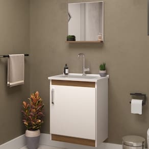 Ele é um conjunto para banheiro compacto, ideal para facilitar a rotina e praticidade no dia a dia em banheiro pequeno ou lavabo. O balcão possui uma porta convencional de dobradiças em aço e puxador cromado, com amplo espaço interno para guardar e organizar seus itens. Também acompanha cuba feita em mármore sintético com furos para instalação de ralo e torneira. Além destes lindos detalhes, a espelheira auxilia na sensação de profundidade do cômodo e possui uma prateleira para acomodar seus objetos de decoração preferidos! Aproveite e deixe seu banheiro ainda mais lindo com este conjunto!