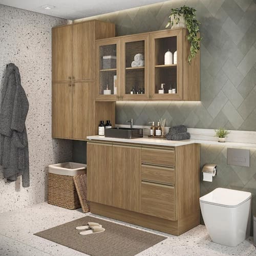 Toda a qualidade e sofisticação do 100% MDF agora no seu banheiro. A Celeste da Kappesberg possui módulos versáteis e fáceis de adaptar conforme cada ambiente, unindo beleza e a qualidade, tornando sua rotina mais completa. Com pintura de até sete camadas, sua cor nogueira, com acabamento touch, é ideal para quem busca por espaços modernos e aconchegantes. Remetendo aos tons da natureza, além de lindo, combina perfeitamente com espaços mais amplos. Com quatro módulos, o combo CB1279 traz ao seu espaço as divisórias perfeitas para um banheiro sempre organizado e funcional. As portas contam com amortecimento, garantindo um fechamento suave, sem ruído e mais durabilidade, enquando o detalhe do vidro reflecta com moldura no aéreo de 120cm proprociona um design único e elegante ao espaço. As gavetas, com corrediças telescópicas, permitem a abertura total e serão perfeitas para itens menores, como escovas, secador de cabelo, presilhas e demais acessórios. A beleza dos módulos se completa com os puxadores, metálicos na cor dourada e com modelos diferentes no balcão e aéreos, transformando seu projeto com estilo. Aposte na Celeste e monte seu banheiro com toda a beleza e praticidade que a Kappesberg oferece.