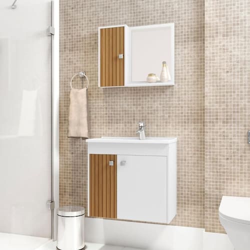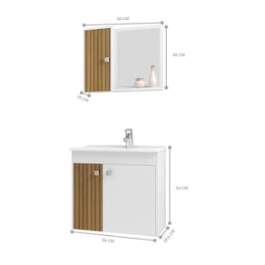 Esse Conjunto para Banheiro é a escolha ideal para quem busca praticidade e estilo no ambiente. O conjunto é elaborado com materiais de alta qualidade, como MDF de 12 mm de espessura e acabamento de verniz poliéster brilhante, garantindo resistência e durabilidade ao produto.