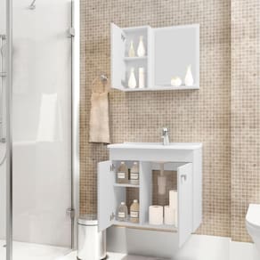 Esse Conjunto para Banheiro é a escolha ideal para quem busca praticidade e estilo no ambiente. O conjunto é elaborado com materiais de alta qualidade, como MDF de 12 mm de espessura e acabamento de verniz poliéster brilhante, garantindo resistência e durabilidade ao produto.