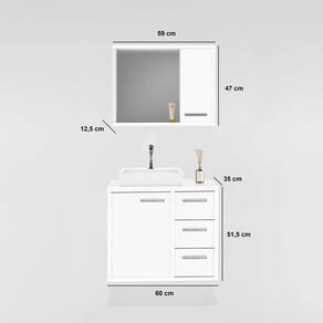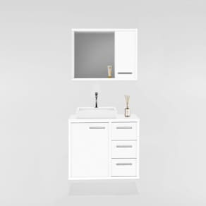 Composto por Espelheira com armário com porta, prateleira interna e espelho, e Gabinete com duas portas, três gavetas com corrediças telescópicas e cuba de apoio / sobrepor inclusa.