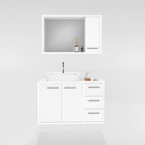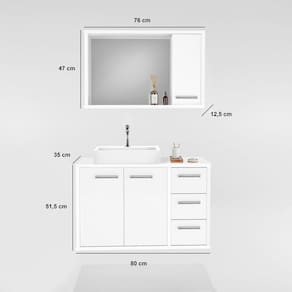 Composto por Espelheira com armário com porta, prateleira interna e espelho, e Gabinete com duas portas, três gavetas com corrediças telescópicas e cuba de apoio / sobrepor inclusa.
