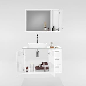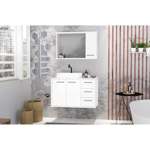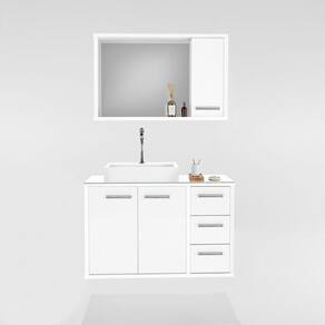 Composto por Espelheira com armário com porta, prateleira interna e espelho, e Gabinete com duas portas, três gavetas com corrediças telescópicas, tampo de vidro e cuba de apoio / sobrepor inclusa.